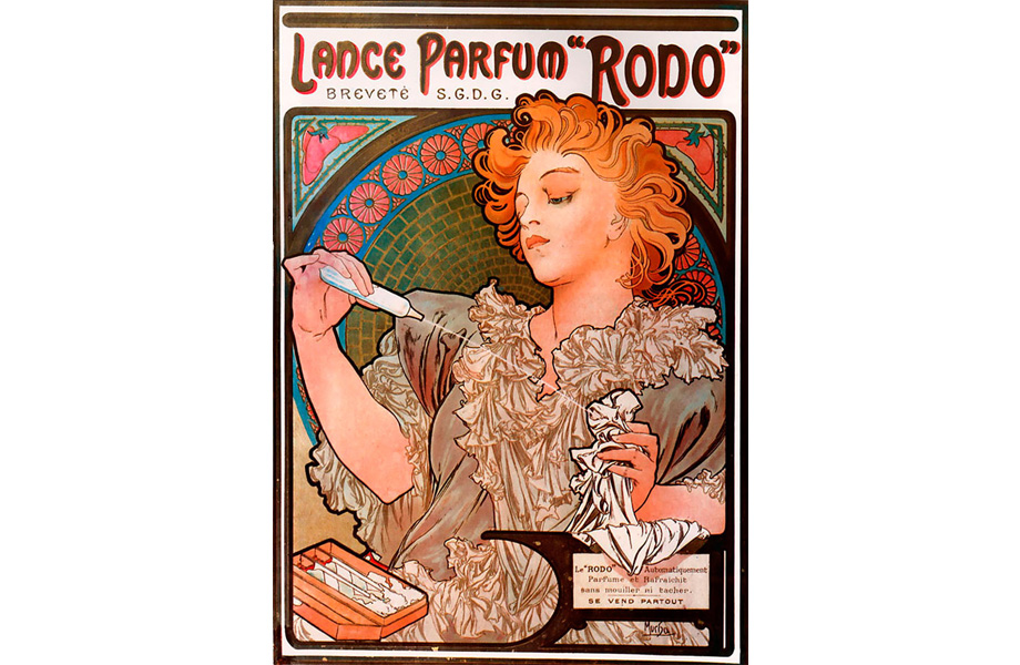 Одним из первых художников ХХ века, начавшего сотрудничать с парфюмерной отраслью, стал Альфонс Муха. Так, для аромата Rodo был нарисован плакат с девушкой, окруженной цветами, – типичный стиль художника и основной мотив его плакатов в стиле ар-нуво.