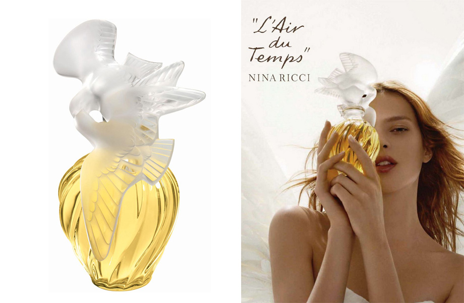 Сложно быть большим поклонником коммерческих ароматов Nina Ricci, если пробовал шедевры от Serge Lutens. Однако, не стоит забывать, что именно этому бренду Лалик посвятил своих роскошных хрустальных голубков для цветочного аромата, созданного в 1948 году. Флакон парфюмерный Дом использует до сих пор для аромата Nina Ricci “L’air du temp”. Красота побеждает и время, и страсть к деньгам, и дурной вкус, и всегда выходит в первые ряды утешить взор жаждущих.