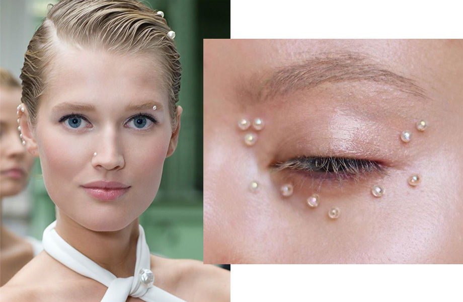 «Начните с вечеринок», – советует Питер Филипс. На осенне-зимнем показе Chanel 2012 года он имитировал пирсинг жемчужинами Swarowski, прикрепив их на клей для накладных ресниц. Три года спустя для весеннего шоу Givenchy королева макияжа Пэт МакГрат надела на моделей маски из тончайшего кружева и жемчуга, а этой весной еще один известный бренд – Gucci – украсил лица девушек перламутровым бисером.