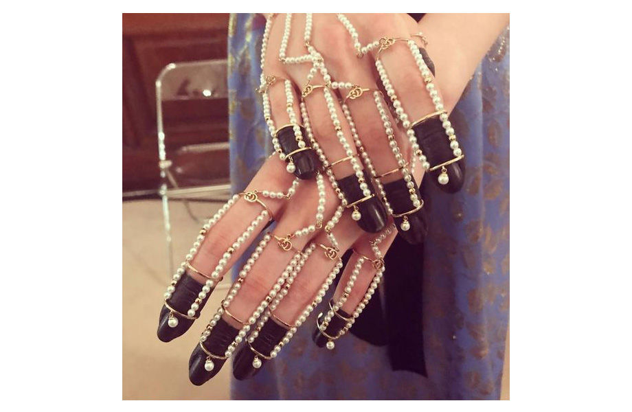 Маникюр с того же шоу заслуживает особого внимания. Бренд представил фантастический hand- и nail-арт, в котором кисти моделей были заключены в импровизированные золотые клетки, соединяющиеся между собой нитями жемчуга.