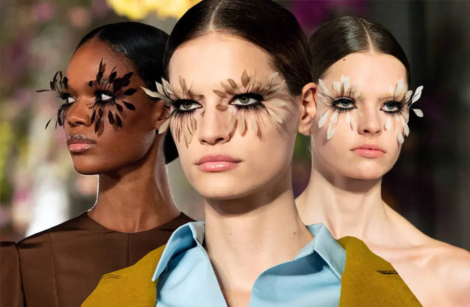 Кропотливость beauty-образов моделей показа читается по манере расположения чудо-перьев: верхний и нижний ресничный ряд буквально – накладными деталями. Стоит отметить, что за красотой и экзотическим видом девушек скрывается масса неудобств, ведь моргать с таким количеством перьев практически невозможно. Однако красота требует жертв!