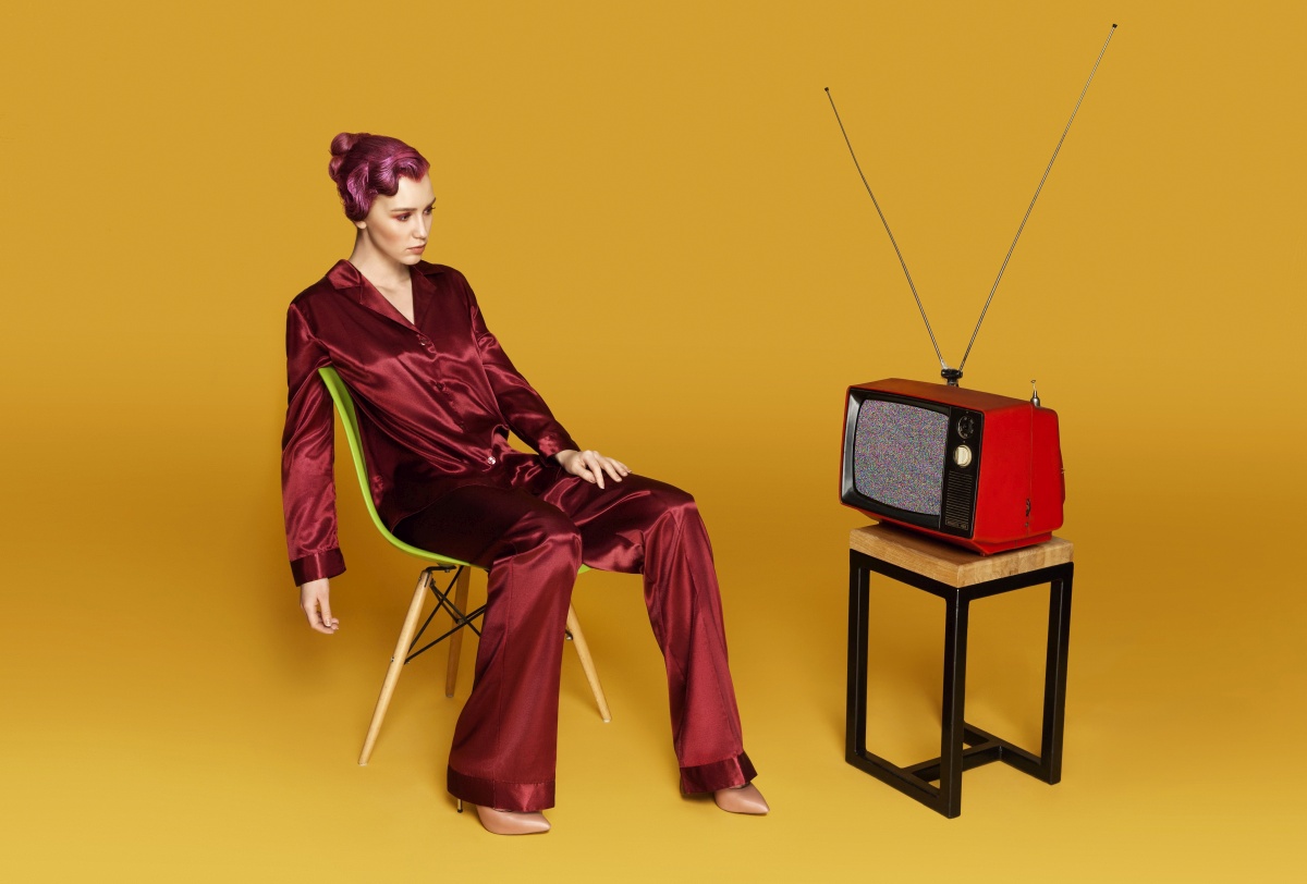 Fashion girl on yellow background looks Retro TV