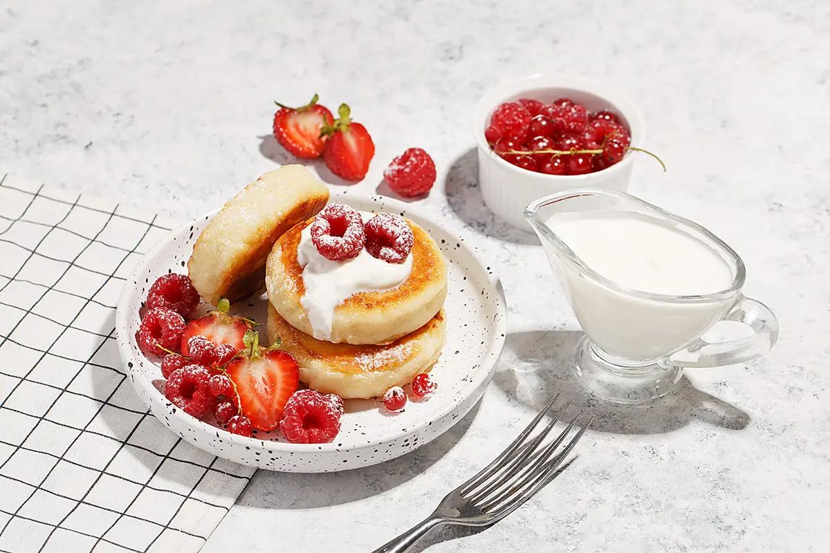 К таким сырникам хорошо подходит мед, кленовый сироп, варенье или сладкая сметанная подлива.