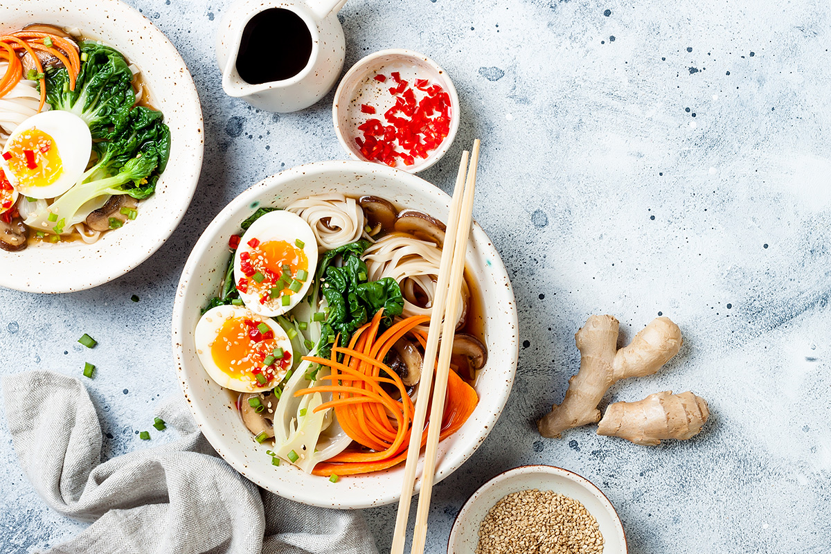 Перед подачей разрежьте вареные яйца, выложите в тарелку с бульоном и лапшой и подавайте, посыпав зеленым луком. Туда же можно добавить кусочки мяса, птицы или ветчины.