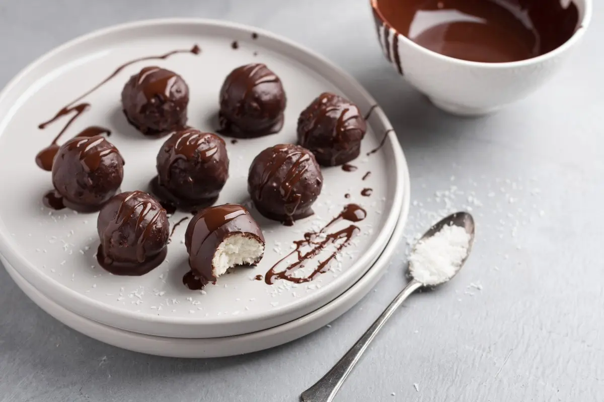 - Добавьте кокосовую стружку в одну миску, а растопленный шоколад — в другую.