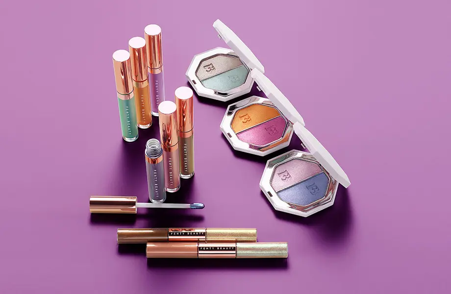 Первая пляжная коллекция Рианны под названием Fenty Beauty Beach Please наполнена пестрыми веселыми продуктами, сияющими текстурами, голографическим блеском и жидким глиттером.