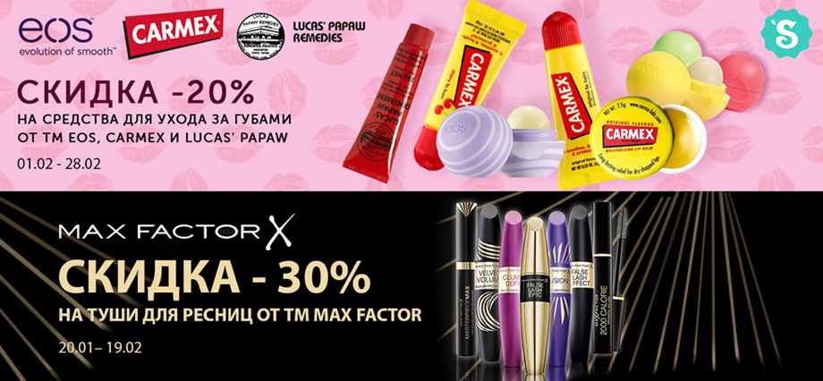 В феврале в магазине красоты действуют скидки: — 30% на туши для ресниц Max Factor, — 20% на бальзамы для губ EOS, Carmex и Lucas’ Papaw, -10% на весь ассортимент бренда Batiste. Кроме того, до 23 февраля на сайте объявлена акция от израильского бренда натуральной косметики KosMystik: купите дневной и ночной кремы для сухой кожи лица и получите в подарок освежающий гель вокруг глаз Antirides Veridique.