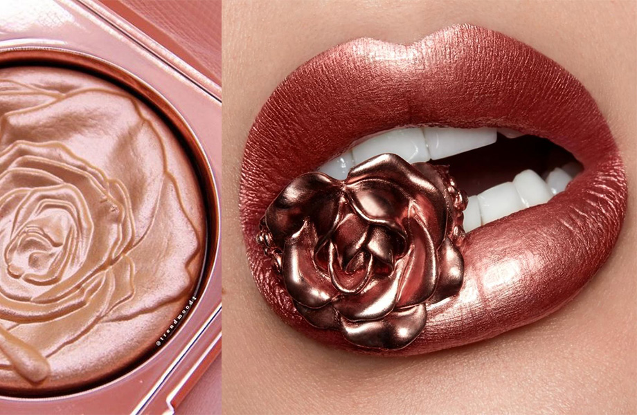 В линейке есть все, чтобы создать монохромный макияж в оттенке Rose Gold: мерцающие пигменты, жидкий лайнер, тени для век и даже клеящиеся элементы для век и губ (привет, вдохновение для фестивального макияжа!). Все средства представлены в сияющей упаковке цвета розового золота, которая мерцает, когда свет падает на неё под прямым углом.