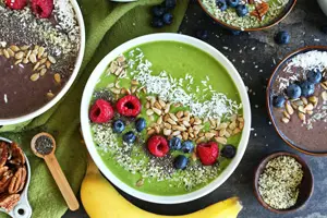Чтобы приготовить классный смузи-боул, вспоминаем правила приготовления смузи. В базе – немного жидкости (вода, кокосовая вода, зеленый чай). Дальше подбираем ингредиенты для вкуса и сладости, и отдельно – для текстуры. Манго, ягоды, яблоко, груша дадут отличную сочность и кислинку, а бананы или авокадо – кремовую гладкость. Иногда облегчаем рецепт до яблока, киви, груши, сельдерея или огурца и зелени – самого полезного ингредиента, который требуется просто добавить и взбить с остальными. Такой прием нужен, чтобы быстро «впитать» всю пользу пучка. Мята, эстрагон, шалфей, тимьян, розмарин, шпинат – самые вкусные варианты для комбинаций. Также всегда можно добавить кусочек корня имбиря, сок лимона или лайма. И не увлекайтесь смешиванием всего подряд, двух-трех ингредиентов вполне достаточно.
