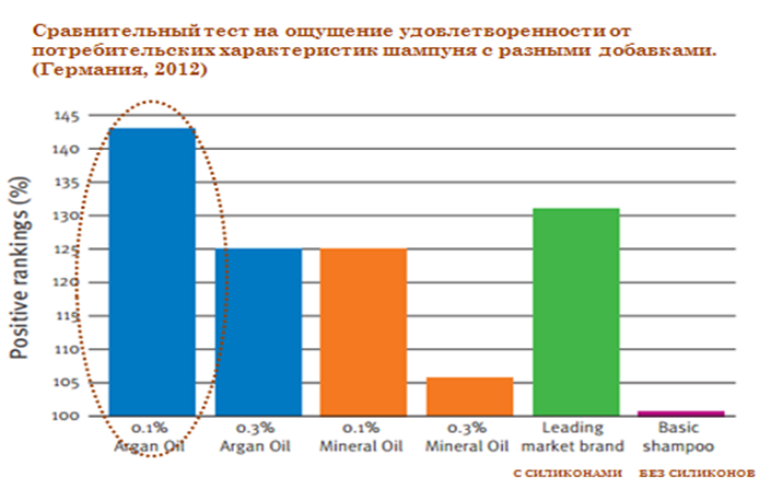 У марокканских женщин есть доисторический рецепт мытья головы. Надо взять глину гассул (еще один уникальный продукт Марокко), смешать с небольшим количеством масла аргании, а затем этой смесью помыть волосы. В этом рецепте есть одно «но». Марокканки не окрашивали волосы синтетическими красителями и защищали их от солнца платками. Современным европейкам такой способ ухода не совсем подходит, поэтому ученые предложили «вариацию на марокканскую тему»: добавлять небольшое количество масла аргании в шампуни, заменяя им силиконы. Почему именно «небольшое», наглядно демонстрирует график.