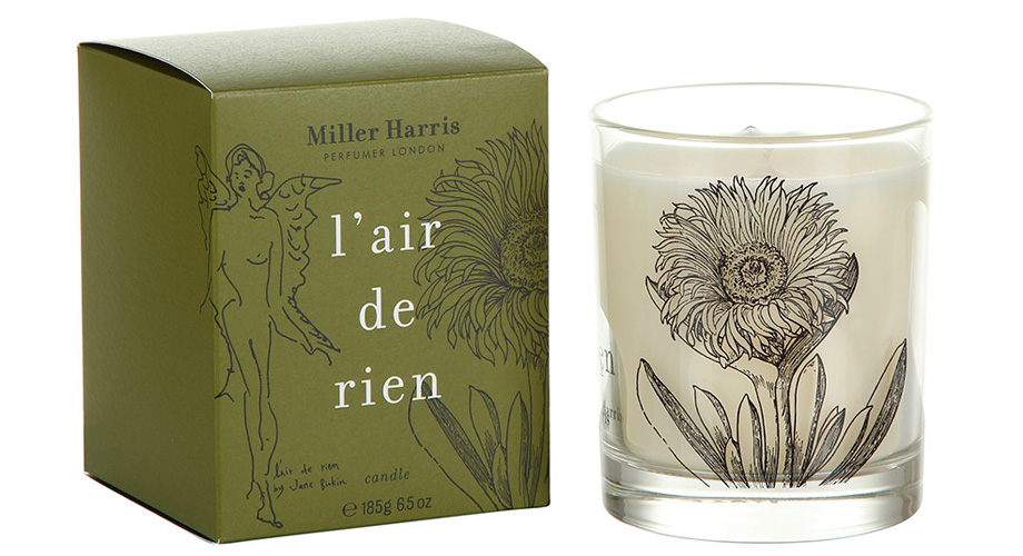 Свеча с композицией из нот дубового мха, пачулей, мускуса, амбры и ванили, напоминающей запах библиотеки в доме Джейн Биркин, L’air de Rien, Miller Harris, 1212 грн., aromateque.com.ua