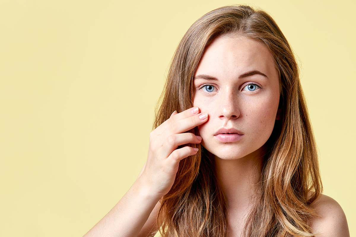 Young redhead teenager with self issues looking into mirror. Girl with low self esteem checking her skin in a mirror.