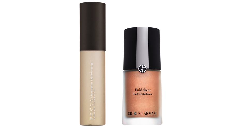 8. Хайлайтеры Becca Shimmering Skin Perfector и Fluid Sheer, Giorgio Armani. Флюид Armani я обычно использую до тональной основы, а после – добавляю кремовый хайлайтер Becca.