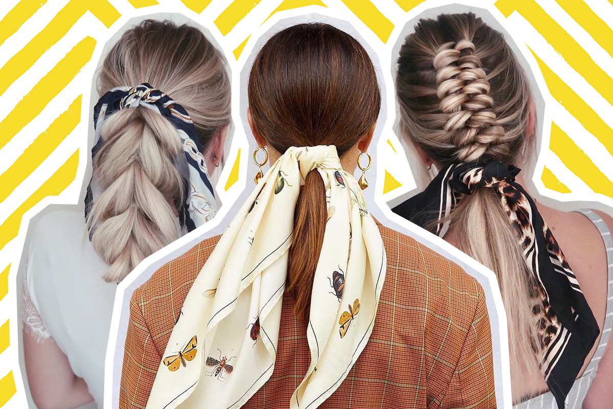 Невесомый шелковый платок — идеальный аксессуар на осень: он не только внесет разнообразие в любой образ, но и спасет волосы от ветра и пушения. Плетения с кокетливым шарфиком, пучок в стиле икон французского кино или тонкий шарф, прикрепленный на самом обычном хвосте, — вариантов модных причесок с платками намного больше, чем кажется.