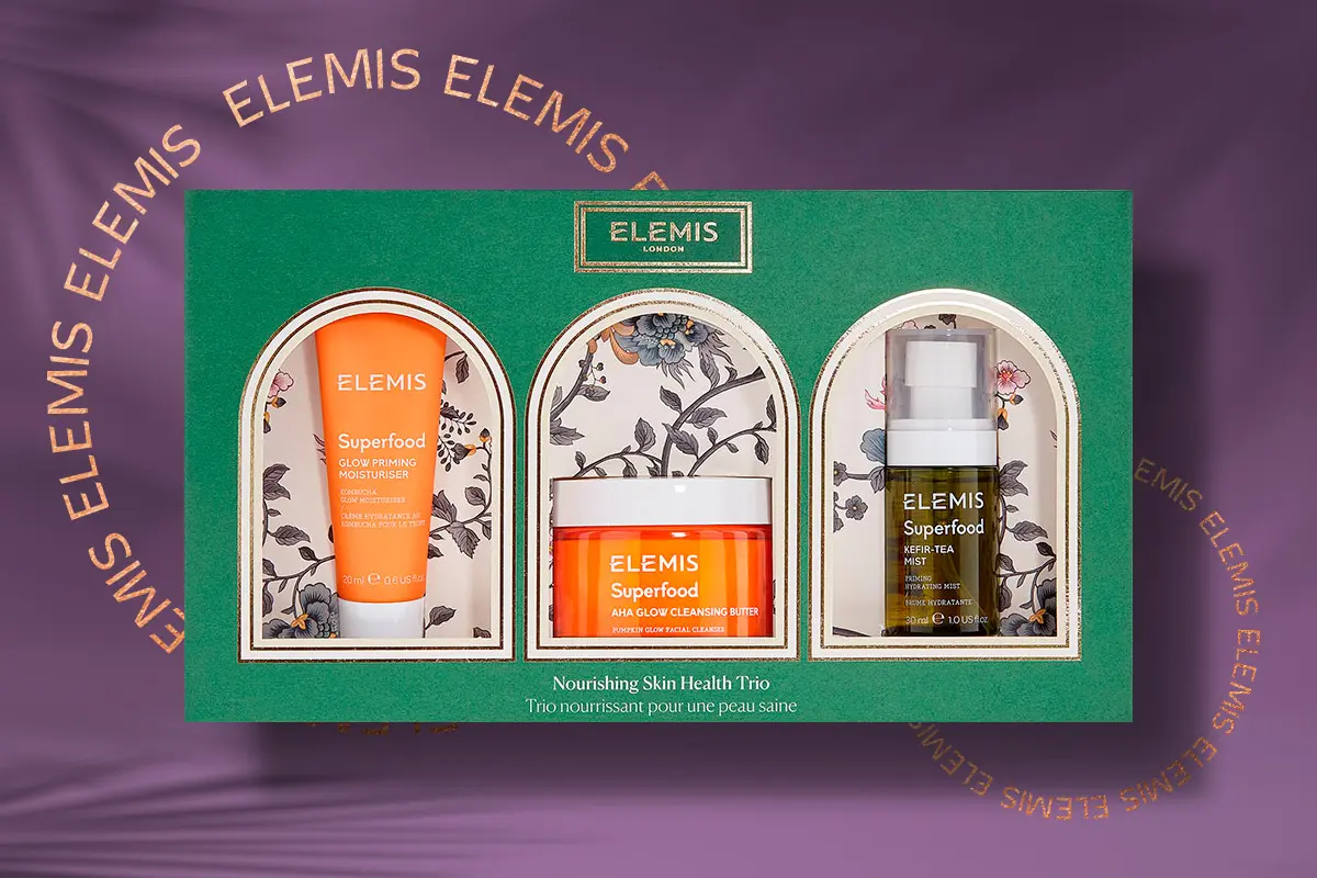 Британський SPA-бренд Elemis представляє лімітований новорічний набір з догляду за шкірою обличчя Nourishing Skin Health Trio, що містить три продукти-бестселери з лінійки Superfood за ціною одного повнорозмірного засобу. Яскравий новорічний набір складається з очищувального бальзаму Superfood AHA Glow Cleansing Butter – 90 г, зволожувального крему-праймера Superfood AHA Glow Priming Moisturiser – 20 мл та зволожувального тонера Superfood Kefir-Tea Mist – 30 мл. Очищувальний бальзам для сяйва шкіри, насичений ліпідами, отриманими з манго і чіа та доповненими міксом з ферментованих суперфудів, тане під час контакту зі шкірою, делікатно видаляючи макіяж та щоденні забруднення. Зволожувальний праймер містить у своїй формулі освітлювальний екстракт чайного гриба і ферментований імбир, що посилює сяйво. Тонер збагачений антиоксидантами: екстрактом чаю ройбуш та веганським ферментом соєвого кефіру, а також містить органічне алое вера, кокосову воду та натуральний пребіотик. Набір підходить для всіх типів шкіри та будь-якого віку. Орієнтовна ціна набору – 1260 грн.