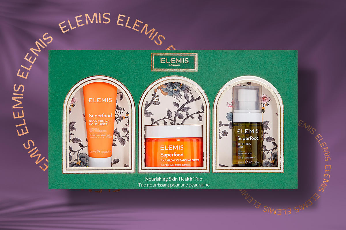 Британський SPA-бренд Elemis представляє лімітований новорічний набір з догляду за шкірою обличчя Nourishing Skin Health Trio, що містить три продукти-бестселери з лінійки Superfood за ціною одного повнорозмірного засобу. Яскравий новорічний набір складається з очищувального бальзаму Superfood AHA Glow Cleansing Butter – 90 г, зволожувального крему-праймера Superfood AHA Glow Priming Moisturiser – 20 мл та зволожувального тонера Superfood Kefir-Tea Mist – 30 мл. Очищувальний бальзам для сяйва шкіри, насичений ліпідами, отриманими з манго і чіа та доповненими міксом з ферментованих суперфудів, тане під час контакту зі шкірою, делікатно видаляючи макіяж та щоденні забруднення. Зволожувальний праймер містить у своїй формулі освітлювальний екстракт чайного гриба і ферментований імбир, що посилює сяйво. Тонер збагачений антиоксидантами: екстрактом чаю ройбуш та веганським ферментом соєвого кефіру, а також містить органічне алое вера, кокосову воду та натуральний пребіотик. Набір підходить для всіх типів шкіри та будь-якого віку. Орієнтовна ціна набору – 1260 грн.
