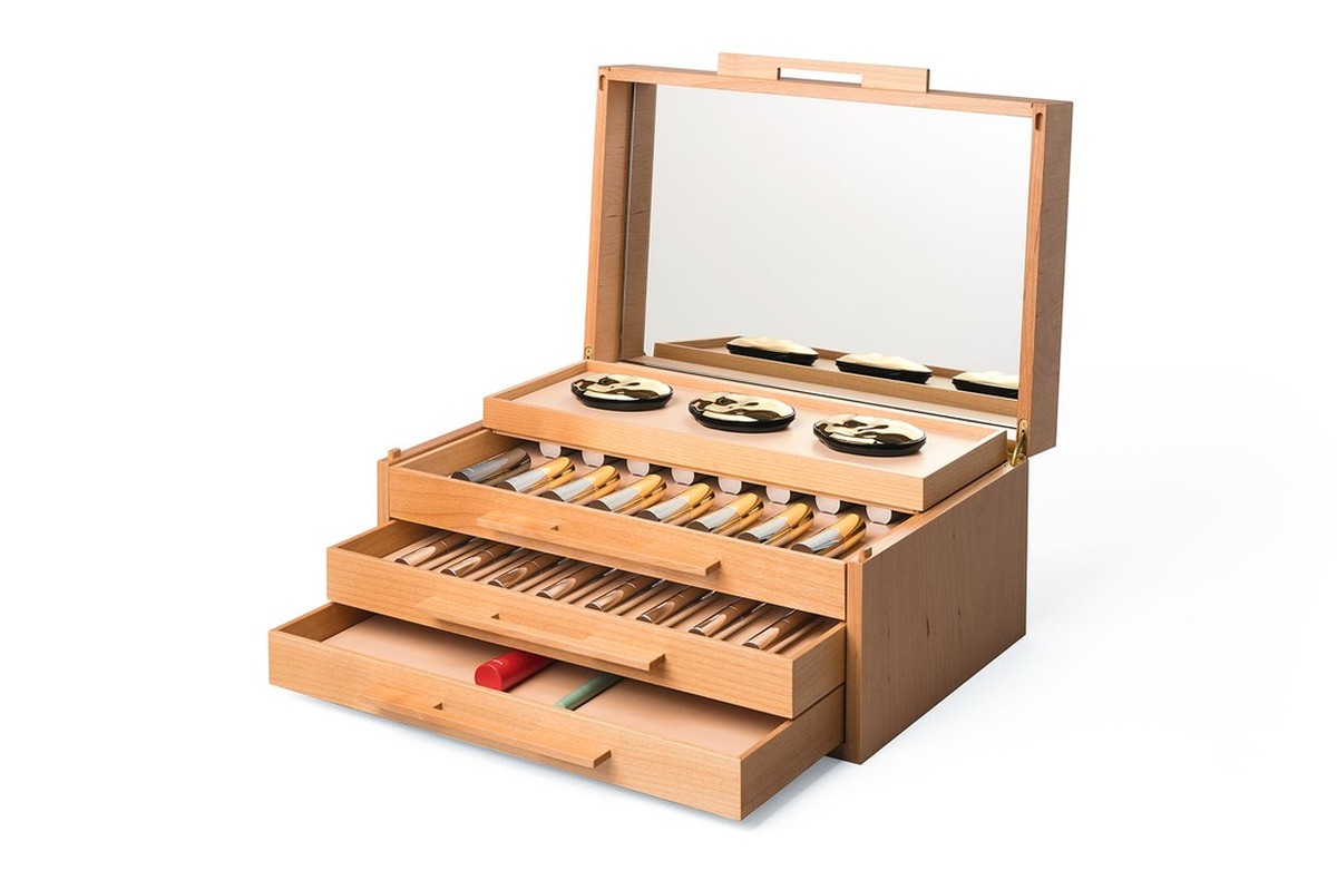 Розкішний ящик ручної роботи з вільхи ділиться на чотири висувних шухляди, оббитих м’якою веганською (штучною) шкірою, а зверху обладнаний великим дзеркалом. Така конструкція цілком здатна служити як портативний туалетний столик у тих випадках, коли ви забажаєте зробити макіяж просто в ліжку, або в інших комфортних місцях.
