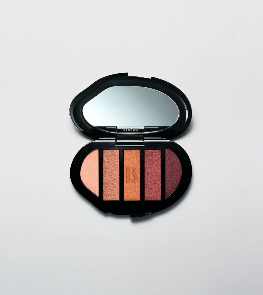 І п’ятикольорова палетка тіней для повік Byredo Dysco Eyeshadow 5 Colours Palette в яскравих нейтрально-теплих золотистих, коричневих і червоних відтінках. У тіней стійка формула, що забезпечує ідеальне покриття і насичений колір.