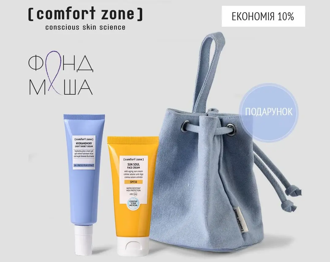 [comfort zone] готовий перераховувати 100% прибутку від продажу лімітованого набору «Зволоження та захист» до ГО «Фонд Маша» – на масштабування програм психологічної реабілітації жінок і дітей. Лімітований косметичний набір [comfort zone] «Зволоження та захист» можна придбати у партнерів – в косметологічних клініках, онлайн на офіційному сайті, та в Instagram @comfortzoneskin_ukraine.
