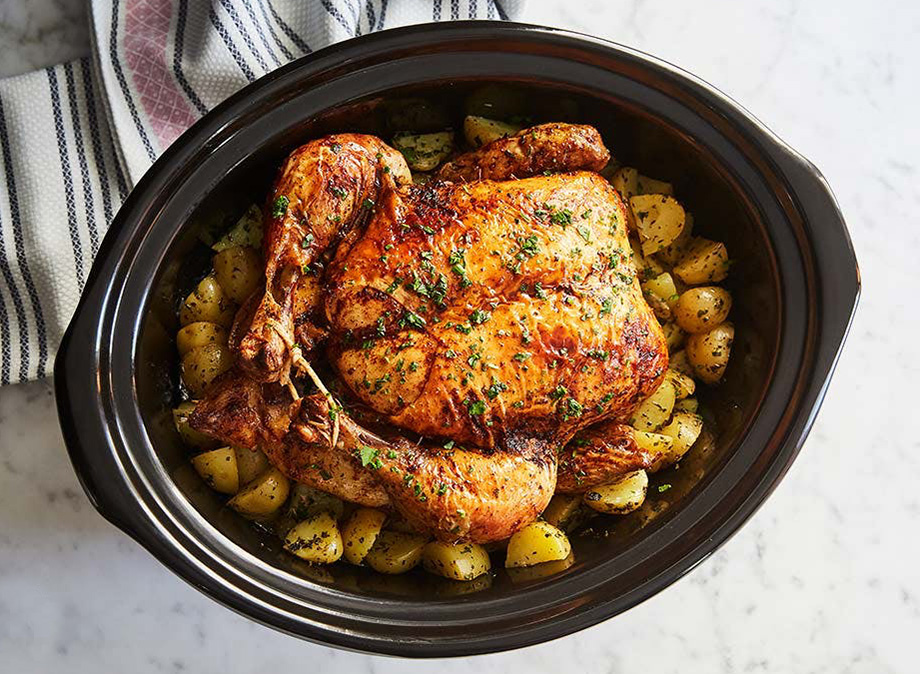 Промойте и просушите картофель, очистите от кожуры, разрежьте на четыре части и выложите в миску. Туда же добавьте эстрагон, орегано, розмарин, оливковое масло, соль и перец по вкусу, хорошо перемешайте и добавьте на противень к курице. Запекайте до готовности (час—полтора, в зависимости от размера птицы).