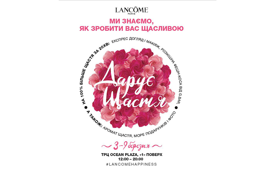 С 3 по 9 марта в ТРЦ Ocean Plaza будет работать «Станця счастья Lancome». Косметологи помогут подобрать правильную косметику по уходу за кожей. Визажисты подскажут, как сделать весенний макияж с помощью декоративных новинок марки. Стилисты-парикмахеры G.Bar научат плести оригинальные косы. Также тут будет работать фотозона. Еще Lancome обещает угощения, подарки всем посетителям и розыгрыш призов каждый день.