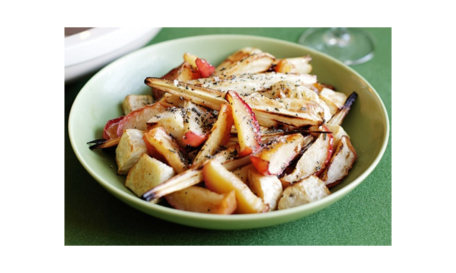 Духовку разогреть до 200°C. Корнеплоды помыть, очистить и нарезать тонкими ломтиками. Приправить маслом, перемешать. Выложить на противень, застеленный пергаментной бумагой. Добавить порезанное яблоко. Запекать 35-40 минут. Через 15 минут добавить на противень и перемешать с корнями и яблоком растертые в ступке или порубленные листья розмарина, смешанные с солью. Допечь до румяного цвета и подавать теплым. Можно с молодым козьим или коровьим сыром.