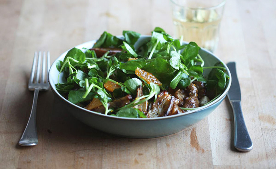 Топинамбур очистить и порезать на четвертинки или более тонкие ломтики. Приправить соком апельсина, цедрой, раздавленным чесноком. Запекать 30-45 минут до размягчения и коричневой корочки. Выложить на тарелку зелень и топинамбур, заправить оливковым маслом, солью и медом.